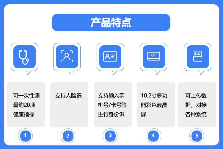 體溫、血氧、血糖、投幣、支付、IC卡/身份證、手機號等身份識別 |